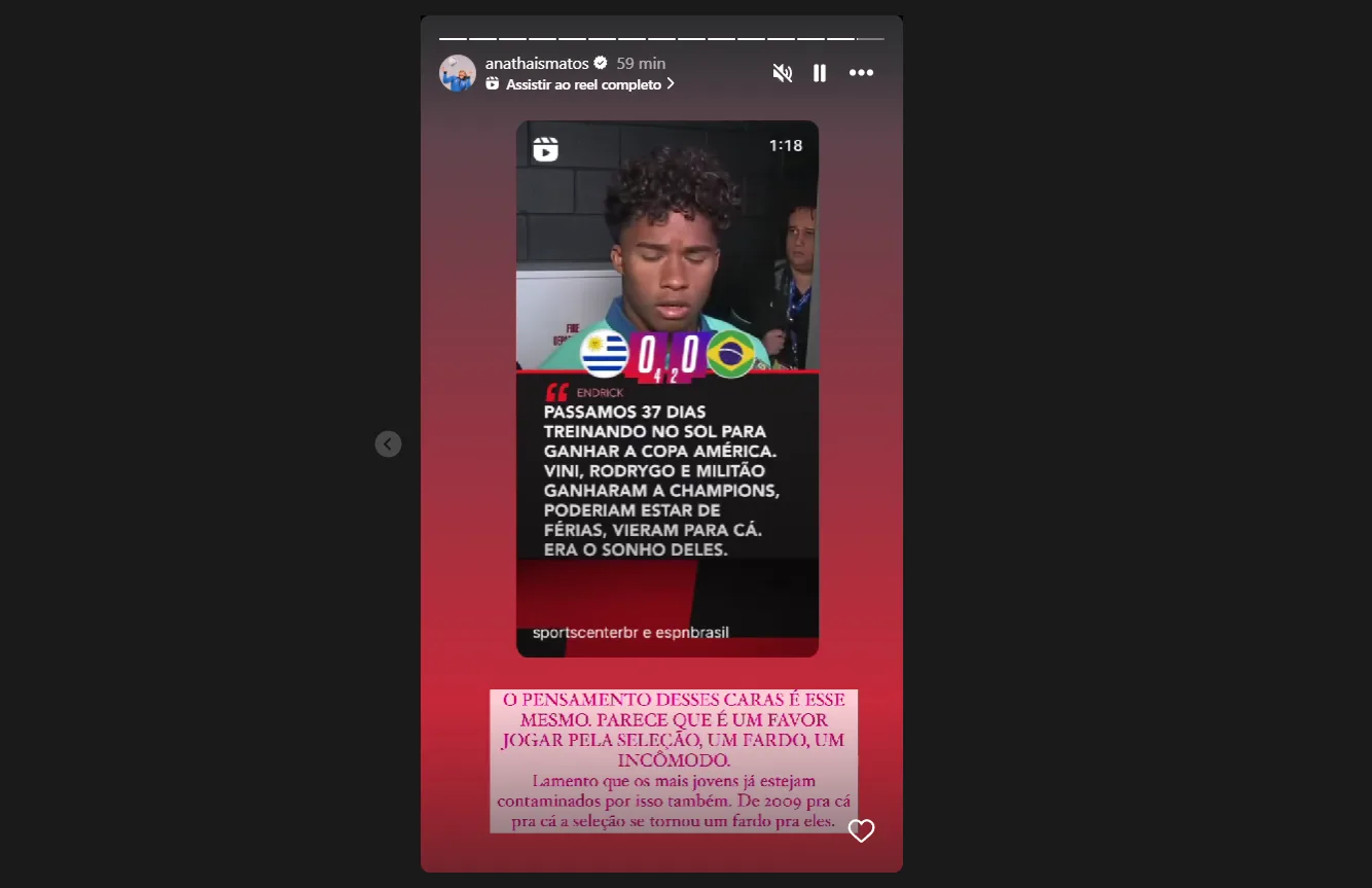 “O pensamento desses caras é esse mesmo. Parece que é um favor jogar pela seleção, um fardo, um incômodo. Lamento que os mais jovens já estejam contaminados por isso também. De 2009 pra cá, a seleção a seleção se tornou um fardo para eles.”, escreveu Ana Thaís, nos stories do Instagram.