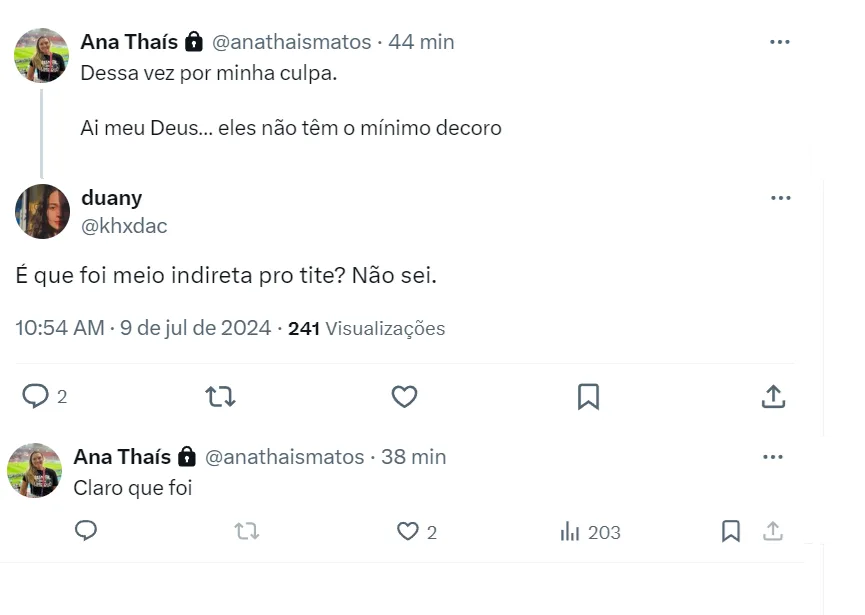 “Dessa vez por minha culpa. Ai meu Deus… eles não têm o mínimo decoro.”, reagiu Ana Thaís, na plataforma X.