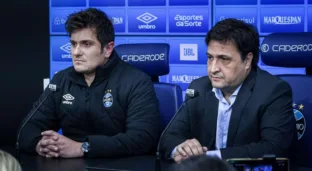 Antônio Brum e Alberto Guerra durante coletiva de imprensa no Grêmio (Maxi Franzoi/AGIF (via AP)