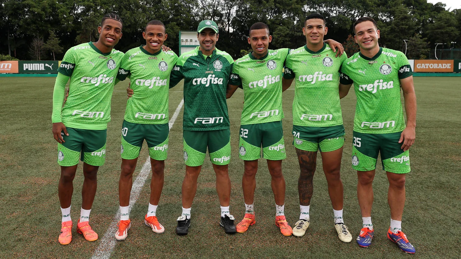 Os jogadores Vanderlan, Jhonatan, Garcia, Naves e Fabinho (E/D) e o técnico Abel Ferreira (C), da SE Palmeiras, durante treinamento, na Academia de Futebol. (Foto: Cesar Greco/Palmeiras/by Canon)
