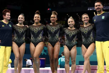 Equipe brasileira de ginástica artística após classificação para final de equipes nas Olimpíadas 2024. (Créditos: Naomi Baker/Getty Images)
