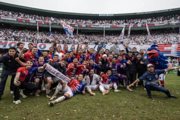 Paraná Clube comemorando o acesso para a primeira divisão do Campeonato Paranaense. (Créditos: Eduardo Huszcz / Paraná Clube, via X)