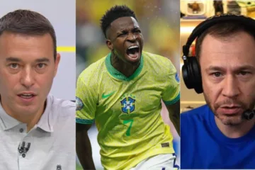 “Esse não é mesmo o Vini do Real Madrid. Esse é o Vini recém-saído do Flamengo, um Vini que jogava para ele. Que dribla para trás, quer dar carretilha o tempo inteiro… Se ele faz isso no Real Madrid, o Florentino Pérez o Ancelotti comem o fígado dele no intervalo. Ele não é louco de fazer isso no Real Madrid”, começou comparando o jornalista sobre a mudança de postura no clube e seleção.
