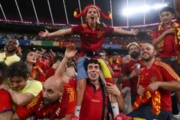 Legenda: Torcedores espanhóis durante a partida Espanha x França na Eurocopa 2024. (Créditos: Stu Forster/Getty Images)