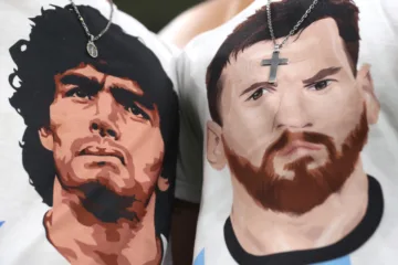 Camisa de torcedores argentinos com os rostos de Diego Maradona e Lionel Messi em jogo da na Copa do Catar (Alex Grimm/Getty Images)