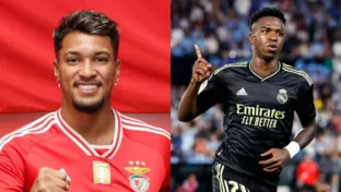 Marcos Leonardo pode ganhar salário parecido ao de Vinícius Júnior no Real Madrid. Fotos: Divulgação Benfica e Real Madrid