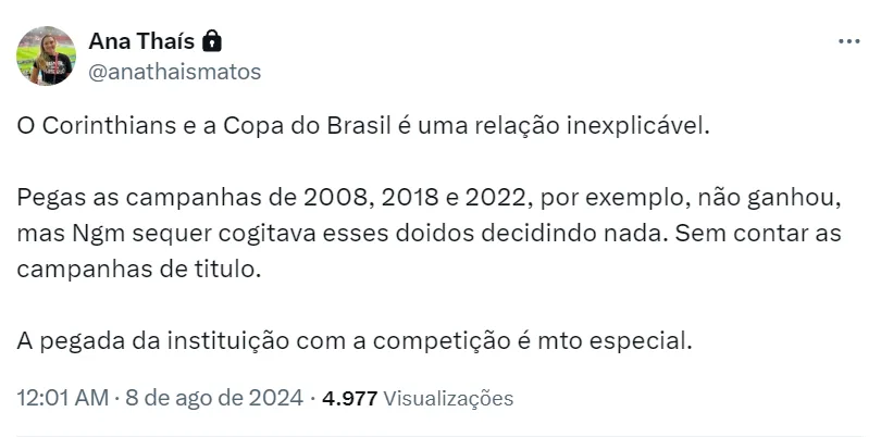 “O Corinthians e a Copa do Brasil é uma relação inexplicável. Pegas as campanhas de 2008, 2018 e 2022, por exemplo, não ganhou, mas ninguém sequer cogitava esses doidos decidindo nada. Sem contar as campanhas de titulo. A pegada da instituição com a competição é muito especial.”, escreveu Ana Thaís, na plataforma X.