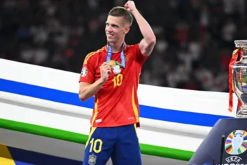 Dani Olmo com a medalha após conquistar a Eurocopa (Tom Weller/dpa/Alamy Live News)