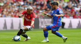El Arouch em ação em jogo entre Lyon e Manchester United ( Mark Runnacles/Getty Images)
