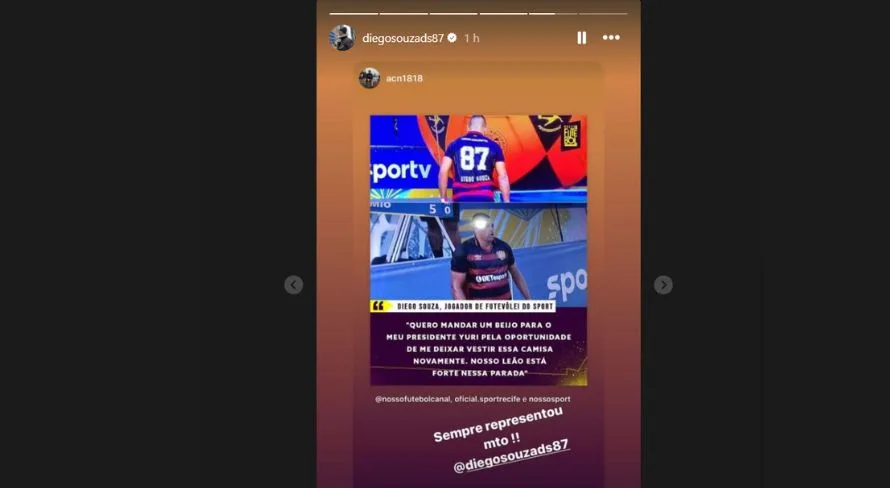 Diego Souza voltou a se declarar ao Sport. Com forte ligação ao rubro-negro pernambucano, o ex-atacante agora representa o Leão na Liga Nacional de Futevôlei. Durante a transmissão de mais um compromisso da equipe, ele aproveitou para agradecer diretamente ao presidente, Yuri Romão, por acreditar no projeto.