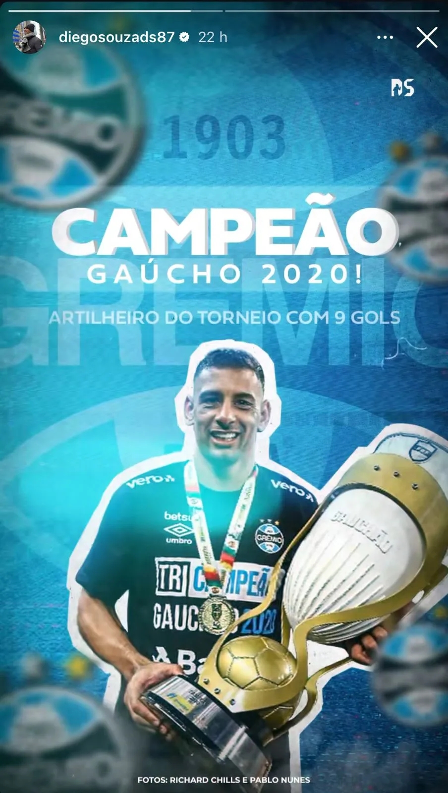 Em vídeo publicado nos stories, o camisa 7 aparece brilhando pelo Grêmio, inclusive em clássico contra o arquirrival Internacional. No certame em questão, além do título, Diego Souza foi o artilheiro com nove gols anotados, sendo peça chave no tricampeonato consecutivo do Tricolor no estado.