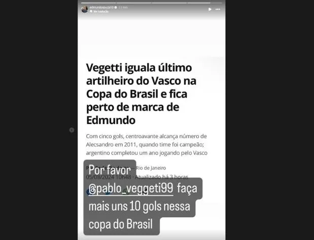 “Por favor, Pablo Vegetti faça mais uns 10 gols nessa Copa do Brasil”, disse Edmundo, nos stories do Instagram.