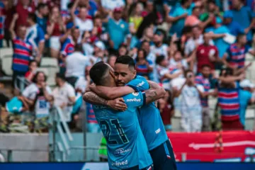 Moisés e Yago Pikachu comemorando gol do Fortaleza contra o Criciúma no Brasileirão. (Créditos: Leonardo Moreira/FEC)