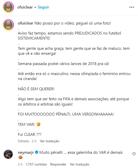 “Muito pênalti … essa galerinha do VAR é demais 😂”, escreveu Neymar, na página Fui Clear.