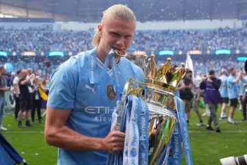 Haaland com o troféu da Premier League (PA Images / Alamy Stock Photo)