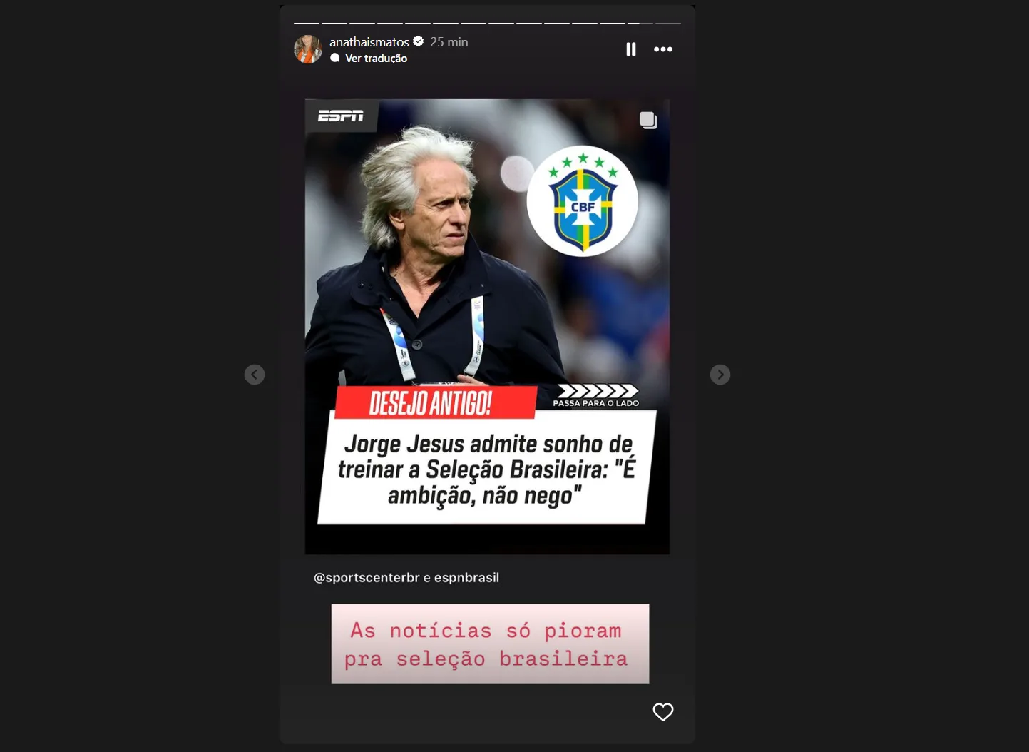 “As notícias só pioram pra seleção brasileira.”, escreveu Ana Thaís, no Instagram.