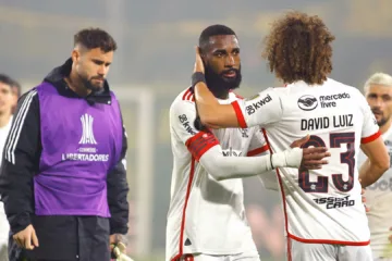 Gerson e David Luiz, do Flamengo, reagem após a derrota da equipe nas quartas de final da Libertadores contra o Peñarol. (Ernesto Ryan / Getty Images)