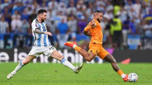Memphis Depay e Lionel Messi disputam a bola durante a Copa do Mundo (Action Plus Sports Images / Alamy Stock Photo)