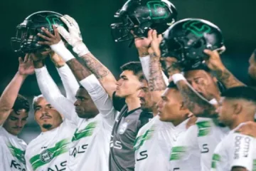 Os jogadores do Coritiba entraram no gramado com três capacetes de futebol americano. Os equipamentos de proteção individual foram erguidos pelo elenco do Coxa antes da bola rolar.