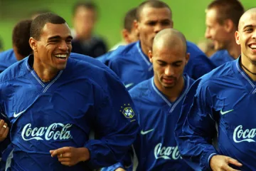 Denilson à esquerda e Ronaldo à direita do Brasil em treinamento pela seleção brasileira (Adam Pretty/ALLSPORT)
