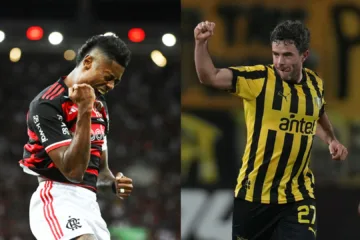Lucas Hernandez, do Peñarol (Associated Press / Alamy Stock Photo) e Bruno Henrique, do Flamengo (SPP Sport Press Photo. / Alamy Stock Photo), montagem por Torcedores.com