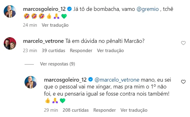 “Eu sei que o pessoal vai me xingar, mas pra mim o primeiro não foi, e eu pensaria igual se fosse contra nós também!”, escreveu Marcos, nos comentários de post no Instagram.