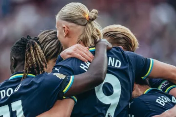 Haaland comemora gol com companheiros na Premier League (Divulgação - City)