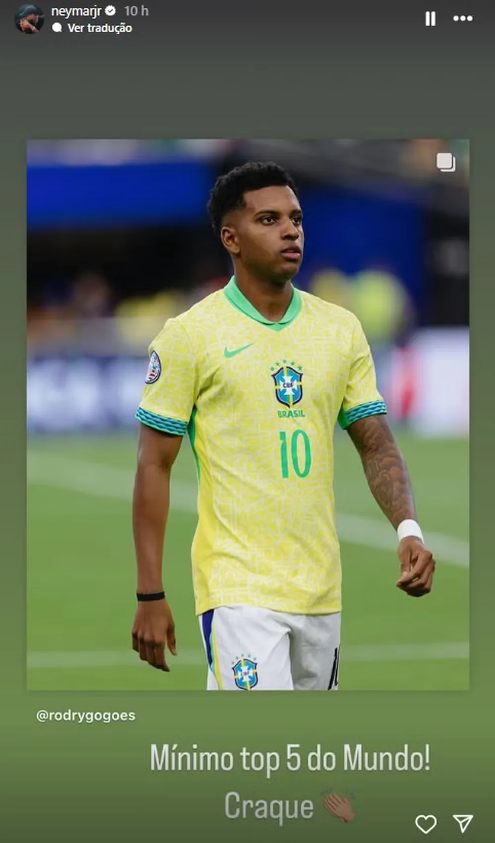 Em seu perfil do Instagram, Neymar compartilhou uma foto de Rodrygo com a camisa 10 da seleção brasileira – que herdou dele próprio após a lesão sofrida no joelho – e elegeu o atleta do time merengue como um dos cinco melhores do mundo em 2023/24.