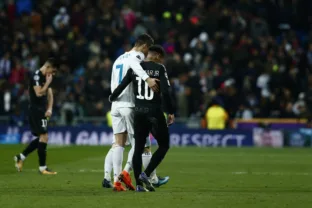 Cristiano Ronaldo, do Real Madrid, e Neymar, do PSG, se abraçam no intervalo de partida da Champions League em 2018 (Gonzalo Arroyo Moreno / Getty Images)