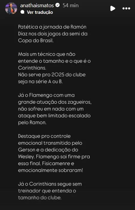 “(Ramón Díaz) Não serve pro 2025 do clube, seja na Série A ou B. O Corinthians segue sem treinador que entenda o tamanho do clube”, finalizou Ana Thaís.