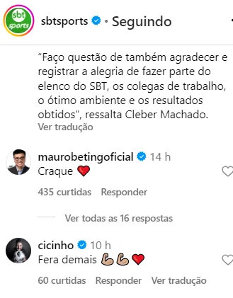 ‘Faço questão de também agradecer e registrar a alegria de fazer parte do elenco do SBT, os colegas de trabalho, o ótimo ambiente e os resultados obtidos’, ressalta Cléber Machado.”