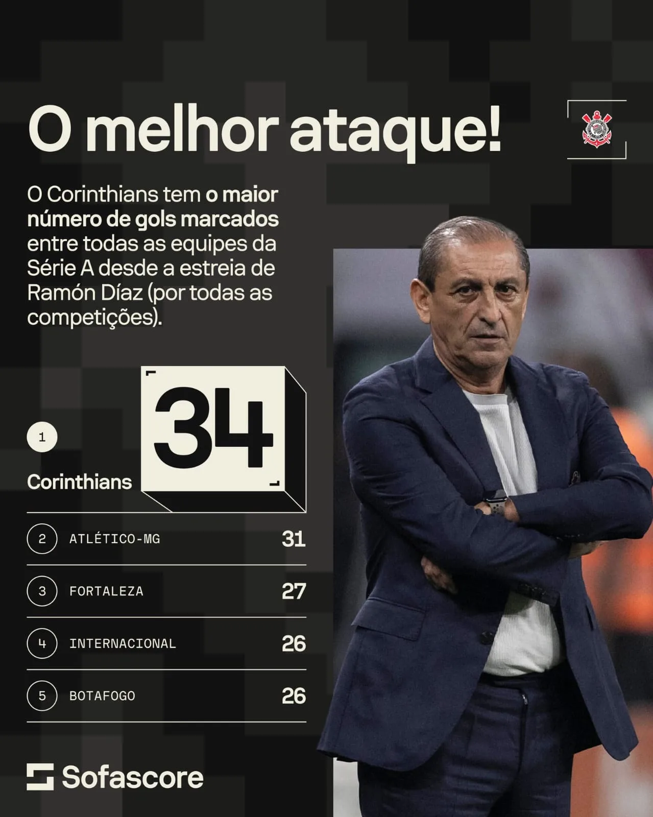 Desde que Ramón Díaz assumiu o cargo de treinador, o Corinthians teve uma melhora considerável no setor ofensivo. Conforme dados do site Sofascore, a equipe paulista é líder entre os times da Série A em gols marcados desde a chegada do novo técnico, superando times como Atlético-MG, Fortaleza, Internacional e Botafogo.