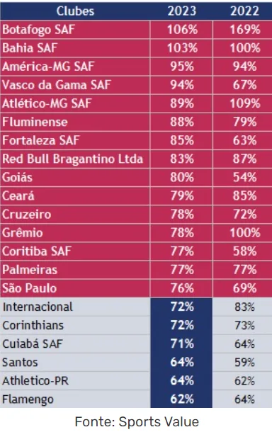 Por outro lado, o estudo mostra um cenário de atenção para Bahia e Botafogo, com um percentual de 103% e 106% respectivamente.