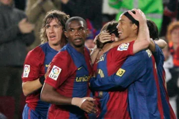 Lionel Messi, comemora seu gol com os companheiros de equipe Ronaldinho, Carles Pujol e Samuel Eto'o em 2007. (AP Photo/Manu Fernandez)