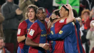 Lionel Messi, comemora seu gol com os companheiros de equipe Ronaldinho, Carles Pujol e Samuel Eto'o em 2007. (AP Photo/Manu Fernandez)