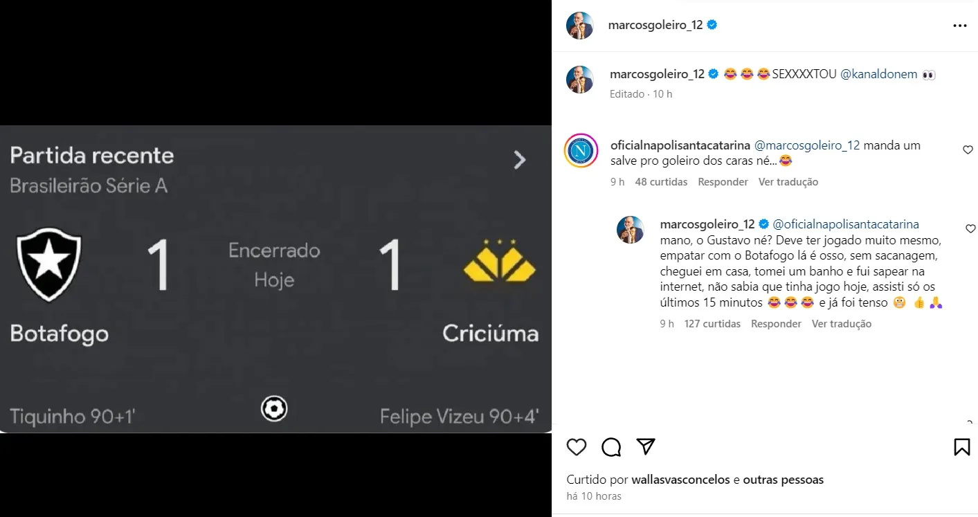 Marcos reagiu ao desfecho de Botafogo x Criciúma, no Maracanã, pelo Brasileirão Betano. Apesar do estádio lotado, o Glorioso teve dificuldades ao longo da partida e, mesmo abrindo o placar nos últimos minutos, não conseguiu manter o resultado. Isso porque o time catarinense, de forma surpreendente, foi competente para buscar um empate que acabou ajudando o Palmeiras.