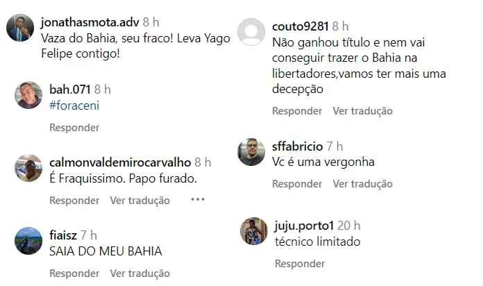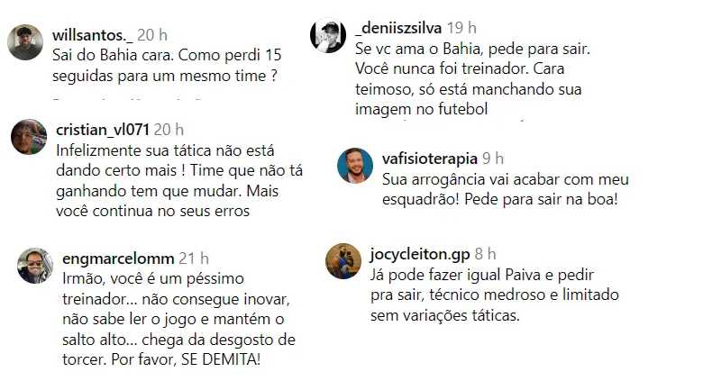 “Você é um péssimo treinador… não consegue inovar, não sabe ler o jogo e mantém o salto alto… chega dá desgosto de torcer. Por favor, se demita.”, pediu um torcedor. “Infelizmente, sua tática não está dando certo mais! Time que não tá ganhando tem que mudar. Mas você continua no seus erros.”, destacou outro internauta. “Sai do Bahia, cara. Como perde (partidas) 15 seguidas para um mesmo time?”, questionou mais um tricolor.