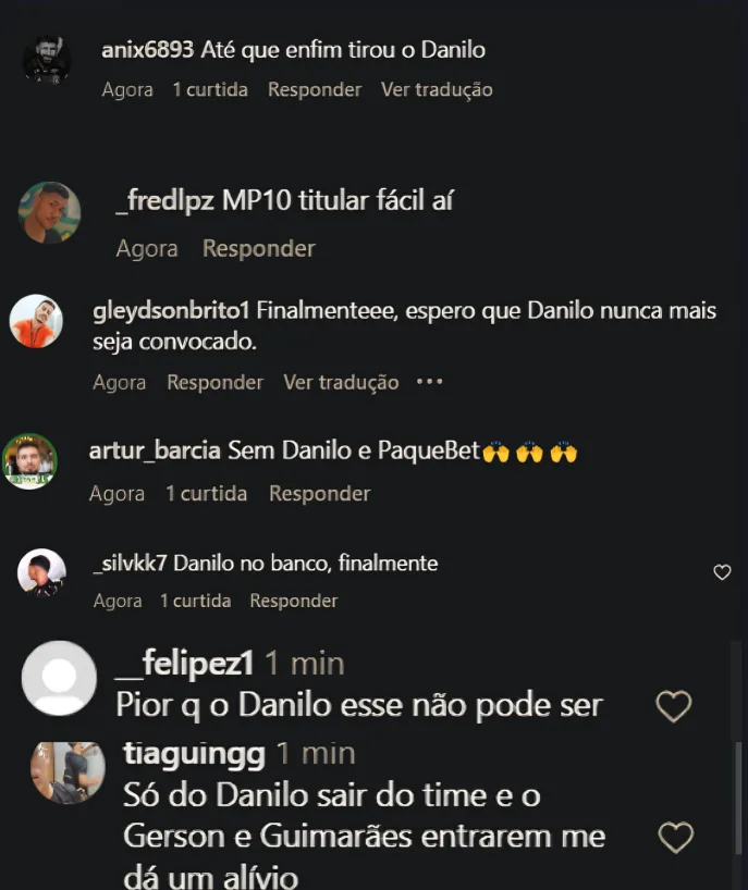 Nas redes sociais, a torcida gostou das mudanças na equipe, sobretudo na lateral-direita. Para muitos, Danilo sequer deveria novamente ser convocado, uma vez que na visão destes não entrega o esperado para ter tanta moral com o treinador.