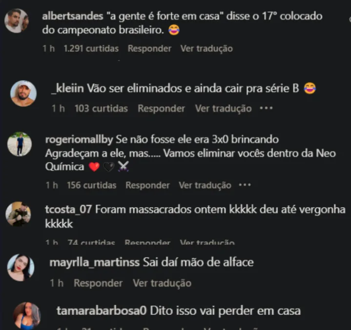 “Ficou barato! Chorou a semana toda e deu resultado! Depois chamam de varmengo! Mas todos sabem a história do Corinthians e arbitragem! Próximo pedido deles é para nao ser rebaixado!!”, irritado um flamenguista, se referindo ao gol anulado de Gabriel Barbosa.