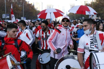 Torcedores do River Plate tocam bateria nas ruas de Madri algumas horas antes da final da Copa Libertadores entre River Plate e Boca Juniors em 2018. Rafael Bastante/SOPA Images/ZUMA Wire/Alamy Live News)