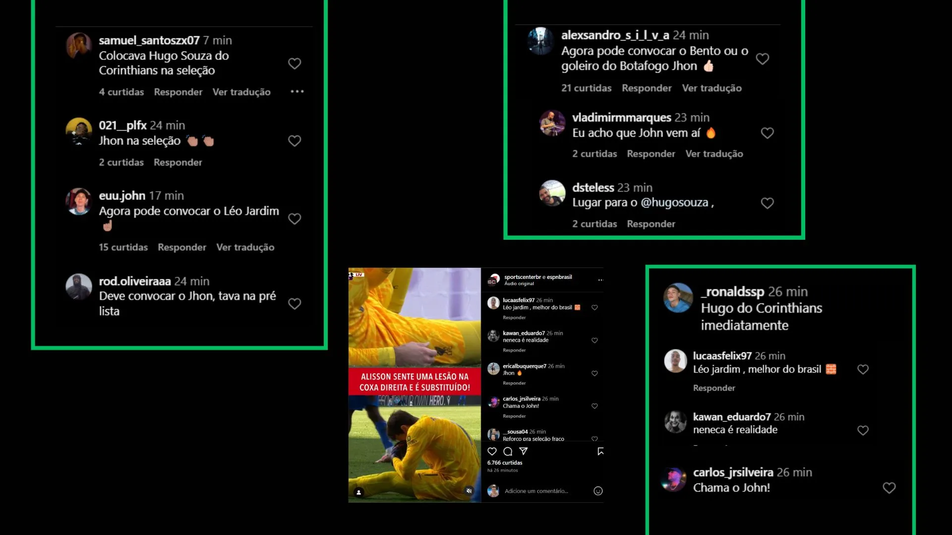 “Colocava Hugo Souza do Corinthians na seleção”, disse um dos torcedores. “Jhon na seleção”, pediu outro. “Agora pode convocar o Léo Jardim”, sugeriu o internauta. “Agora pode convocar o Bento ou o goleiro do Botafogo, John”, comentou o torcedor.