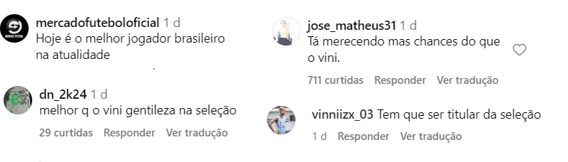 “Hoje é o melhor jogador brasileiro na atualidade.”, indicou um internauta. “Tá merecendo mais chances do que o Vini.”, cravou outro torcedor. “Melhor que o Vini Gentileza na seleção.“, provocou outro seguidor.