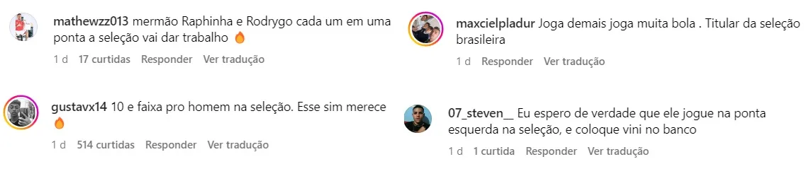 “10 e faixa pro homem na seleção. Esse sim merece.” indagou mais um internauta. “Joga demais, joga muita bola. Titular da seleção brasileira”, destacou outro seguidor. “Raphinha e Rodrygo cada um em uma ponta, a seleção vai dar trabalho.”, reforçou outro brasileiro. “Eu espero de verdade que ele jogue na ponta esquerda na seleção e coloque o Vini no banco.”, sugeriu um torcedor.