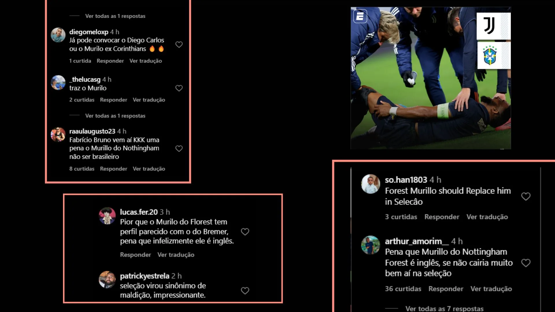 “Melhor zagueiro brasileiro atualmente. Está fora da temporada”, lamentou outro. “Pena que Murillo do Nottingham Forest é inglês, se não cairia muito bem aí na seleção”, alfinetou mais um.