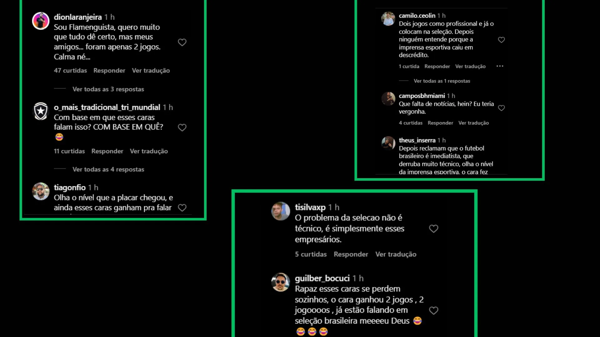 Nos comentários da publicação, diversos internautas subiram o tom contra os jornalistas, classificando que ainda é muito cedo para prospectar Filipe Luís como profissional apto para o cargo. Desde que assumiu o escrete, Dorival acumula quatro vitórias, cinco empates e apenas uma derrota.