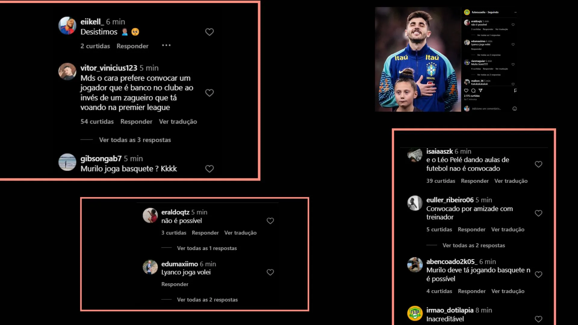 “Desistimos”, disparou um dos torcedores. “Meu Deus, o cara prefere convocar um jogador que é banco no clube ao invés de uma zagueiro que está voando na Premier League”, criticou outro. “Murillo joga basquete?”, ironizou mais um internauta.