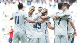 Luka Modric comemora seu gol com seu companheiro de equipe durante a partida da LaLiga contra o Osasuna no Santiago Bernabeu em 2016 (David Gato/Alamy Live News)