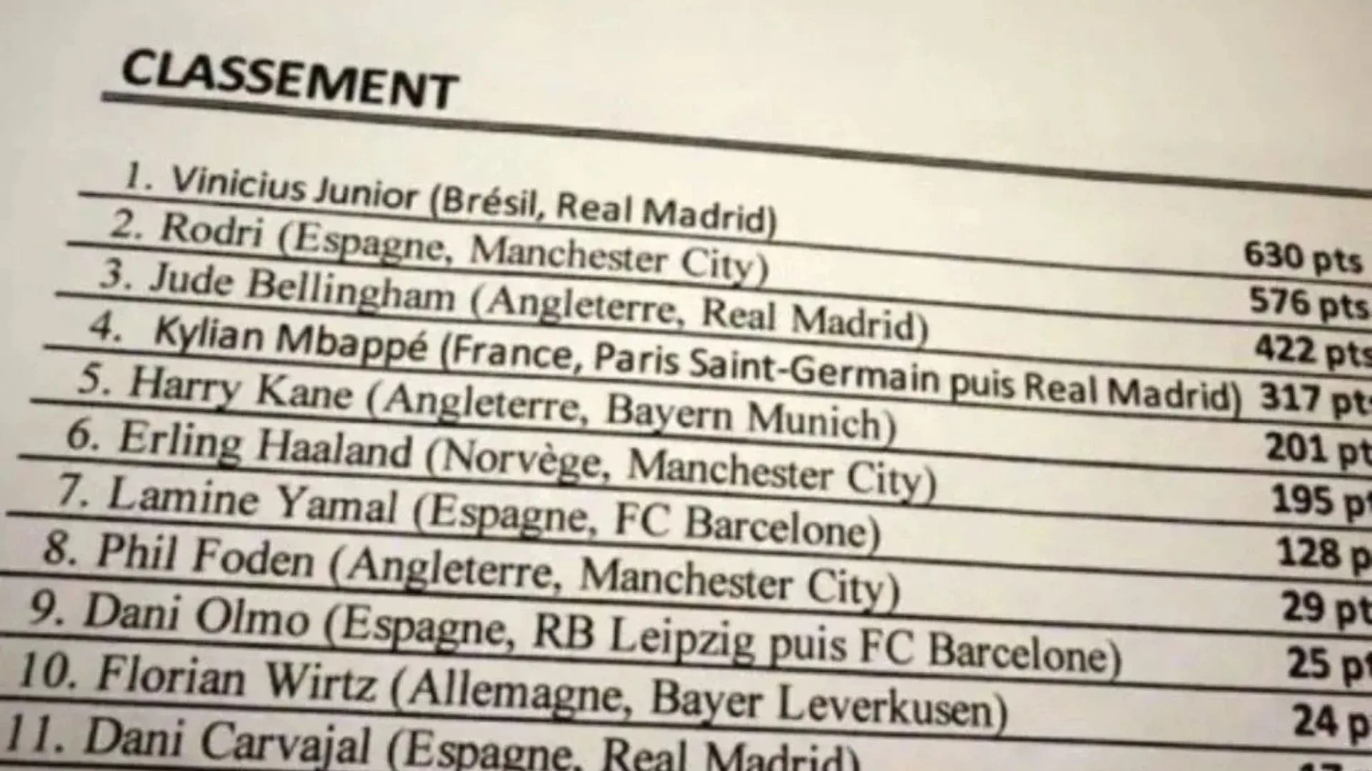 Segundo a suposta lista, Rodri, meio-campista do Manchester City, aparece na segunda posição, com 576 pontos, seguido do companheiro de Vinícius Júnior, Jude Bellingham. Meses antes da prêmio, o veículo francês anunciou uma lista com 30 jogadores indicados. Vini é o único representante nacional.
