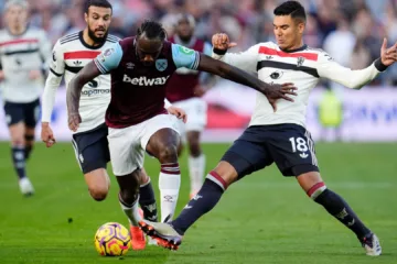 Michail Antonio, do West Ham United (à esquerda), é abordado por Casemiro, do Manchester United (à direita), durante a partida da Premier League (Nick Potts / PA Images / Alamy Stock Photo)
