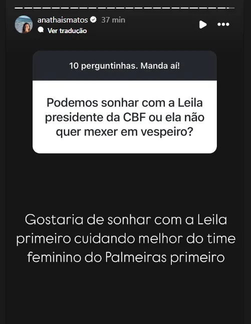 Uma das perguntas foi a seguinte: “Podemos sonhar com a Leila presidente da CBF ou ela não quer mexer no vespeiro?”